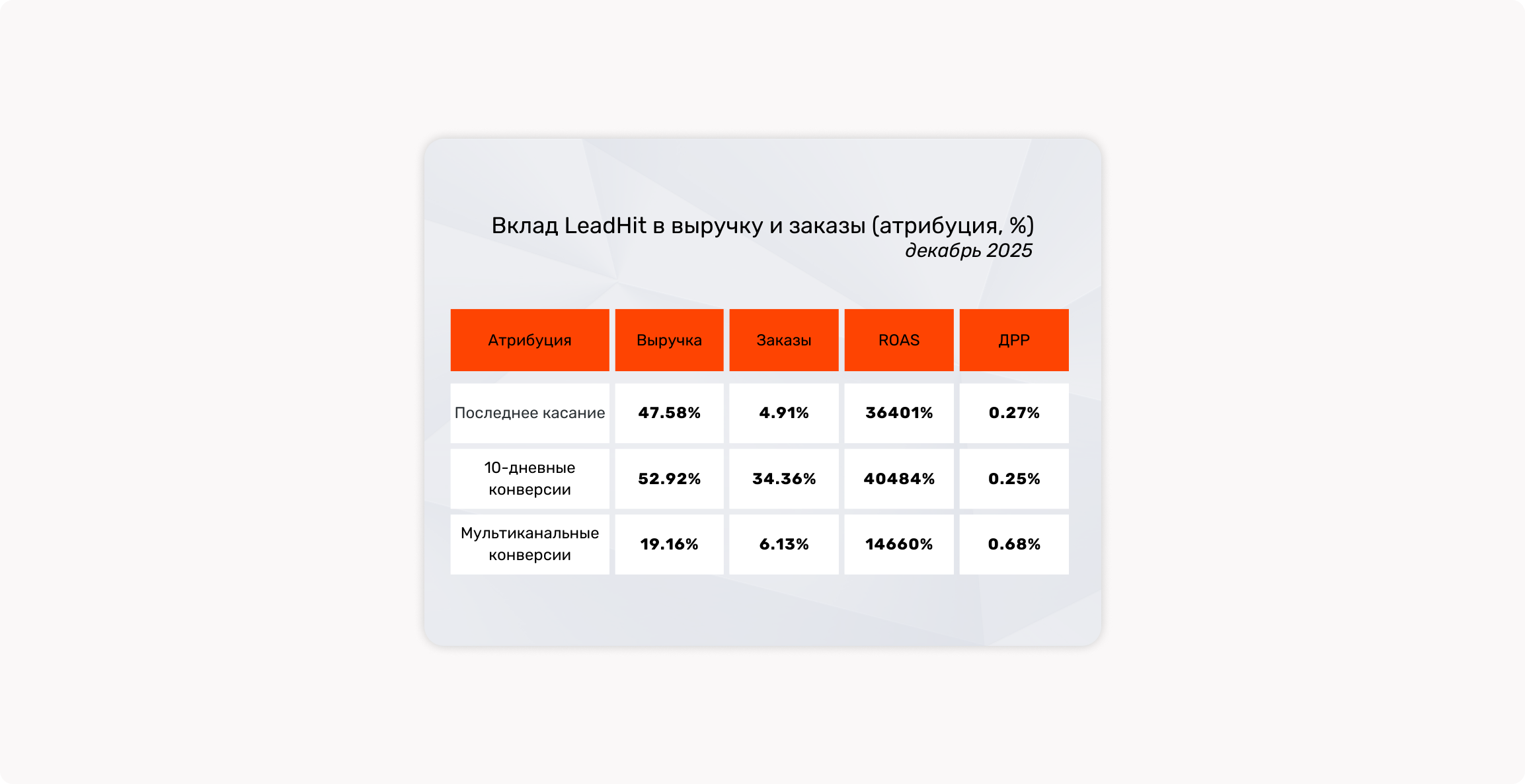 Что важно: в декабре LeadHit был одним из каналов, которые реально влияли на покупки — по 10‑дневной модели сервис участвовал в 34.36% заказов и 52.92% выручки. При этом связка ROAS 40484% и ДРР 0.25% показывает высокую окупаемость при минимальной доле расходов.