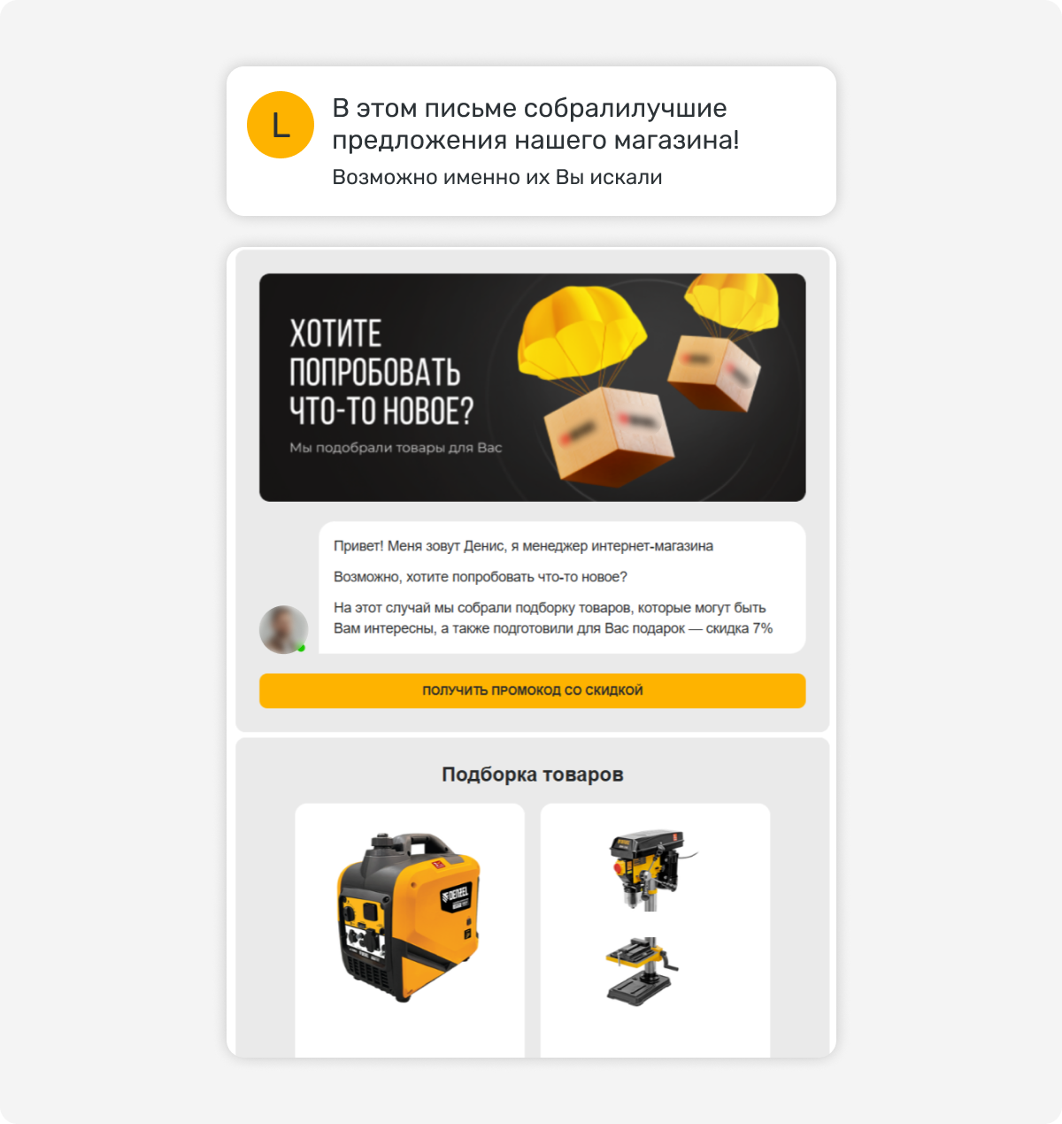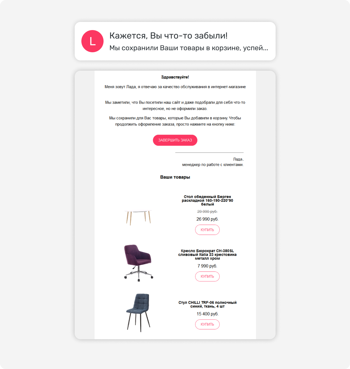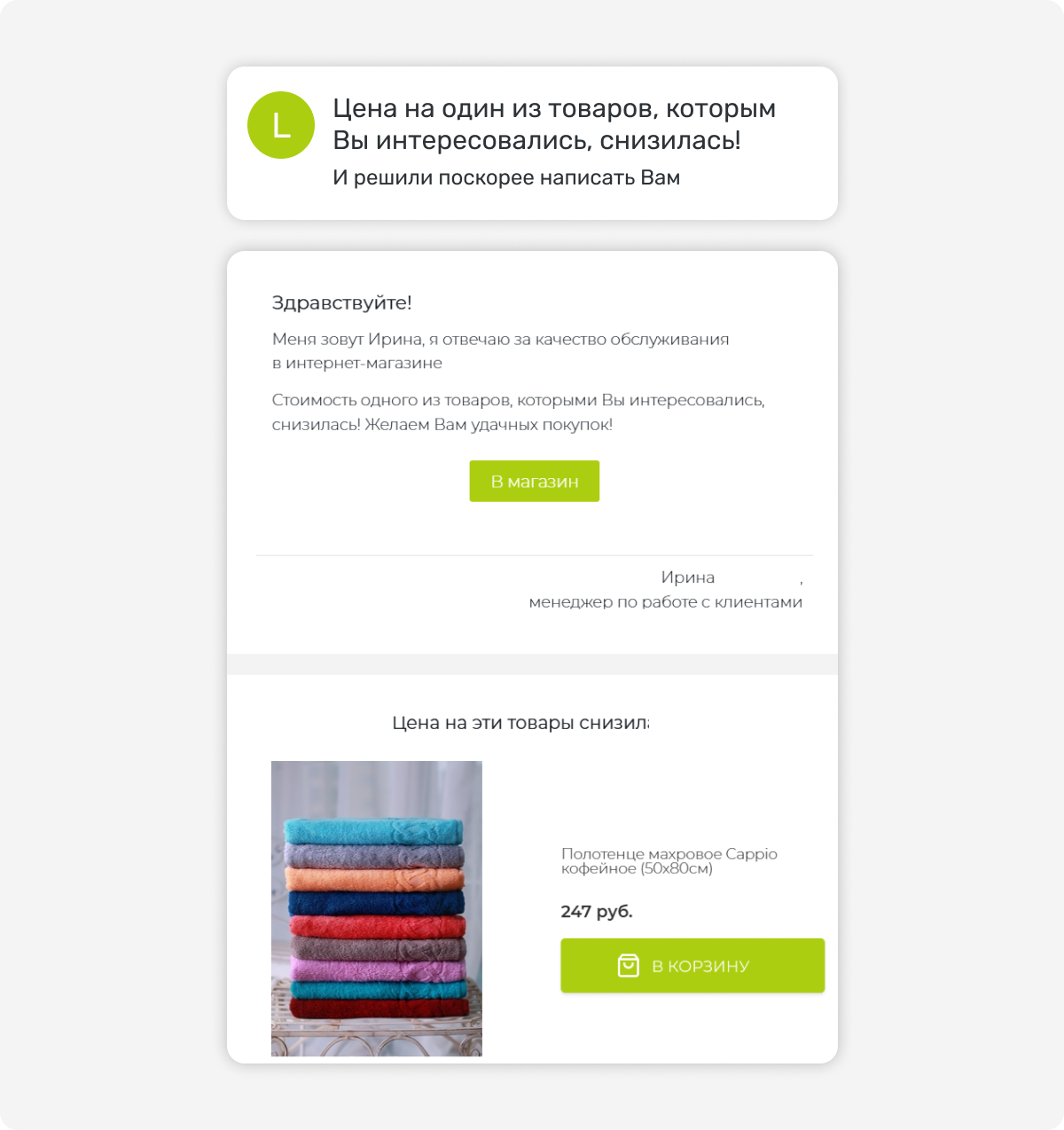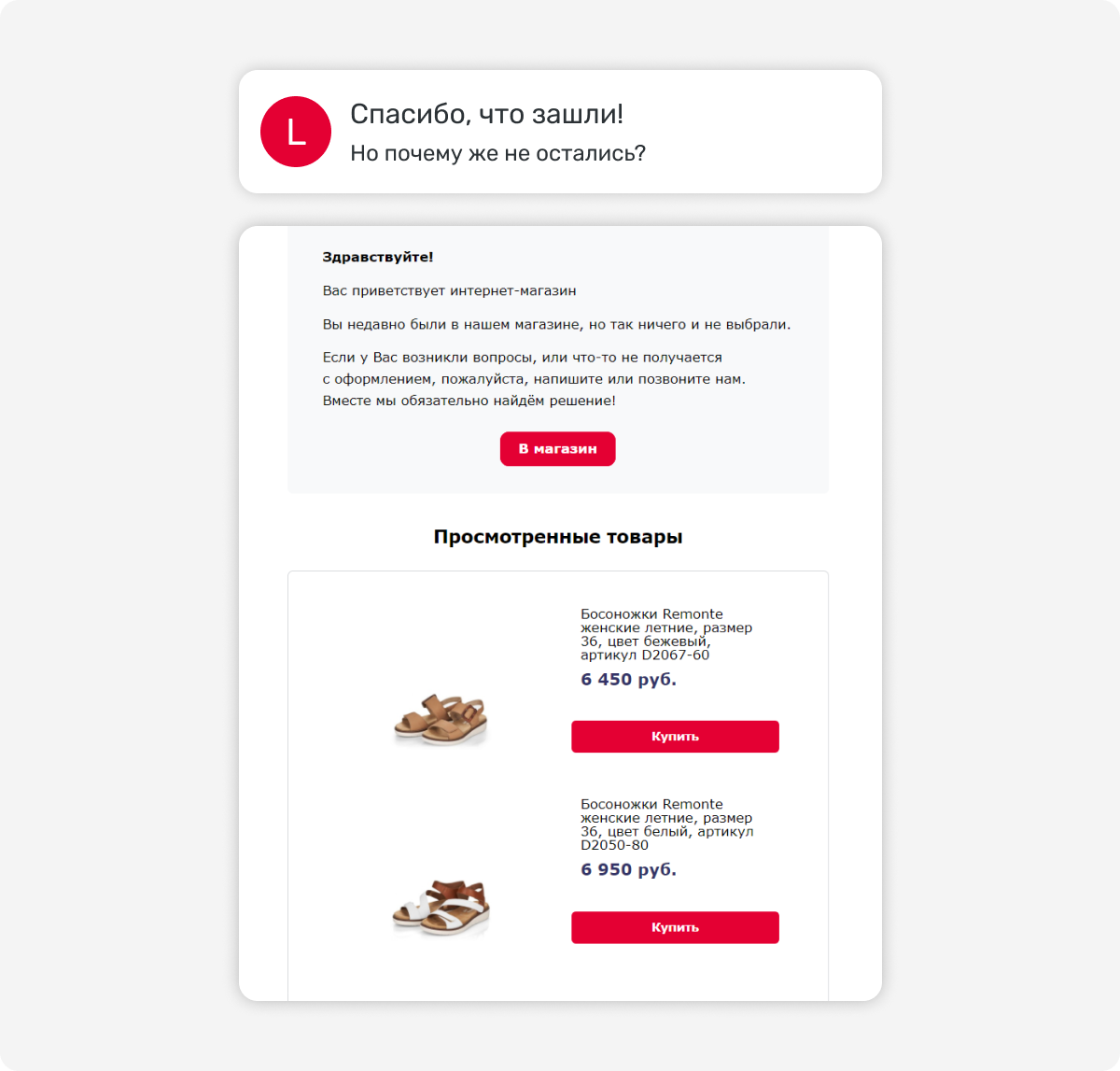 Письмо уходит покупателю, который изучал конкретные товары или категорию, но не совершил никакого целевого действия. В письме — те товары, которые он смотрел, плюс похожие варианты, которые могут его заинтересовать.