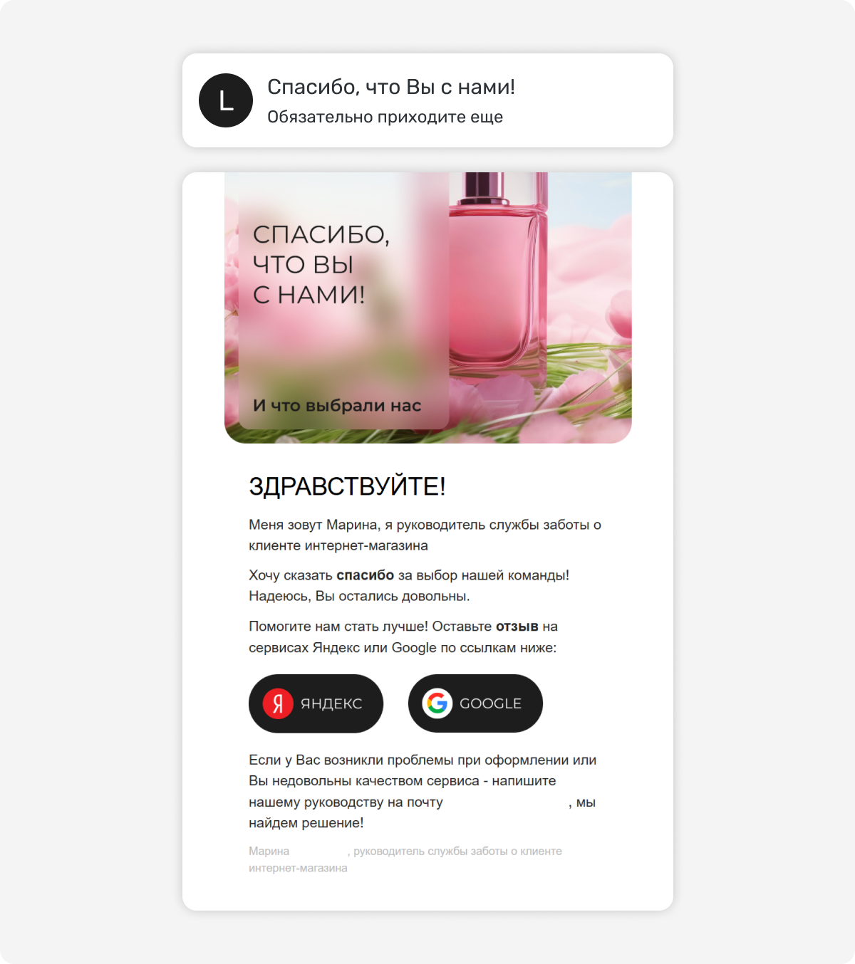 Большинство магазинов после успешной покупки отправляют только технические письма: «Ваш заказ принят», «Заказ отправлен», «Заказ доставлен». Это необходимо, но недостаточно.