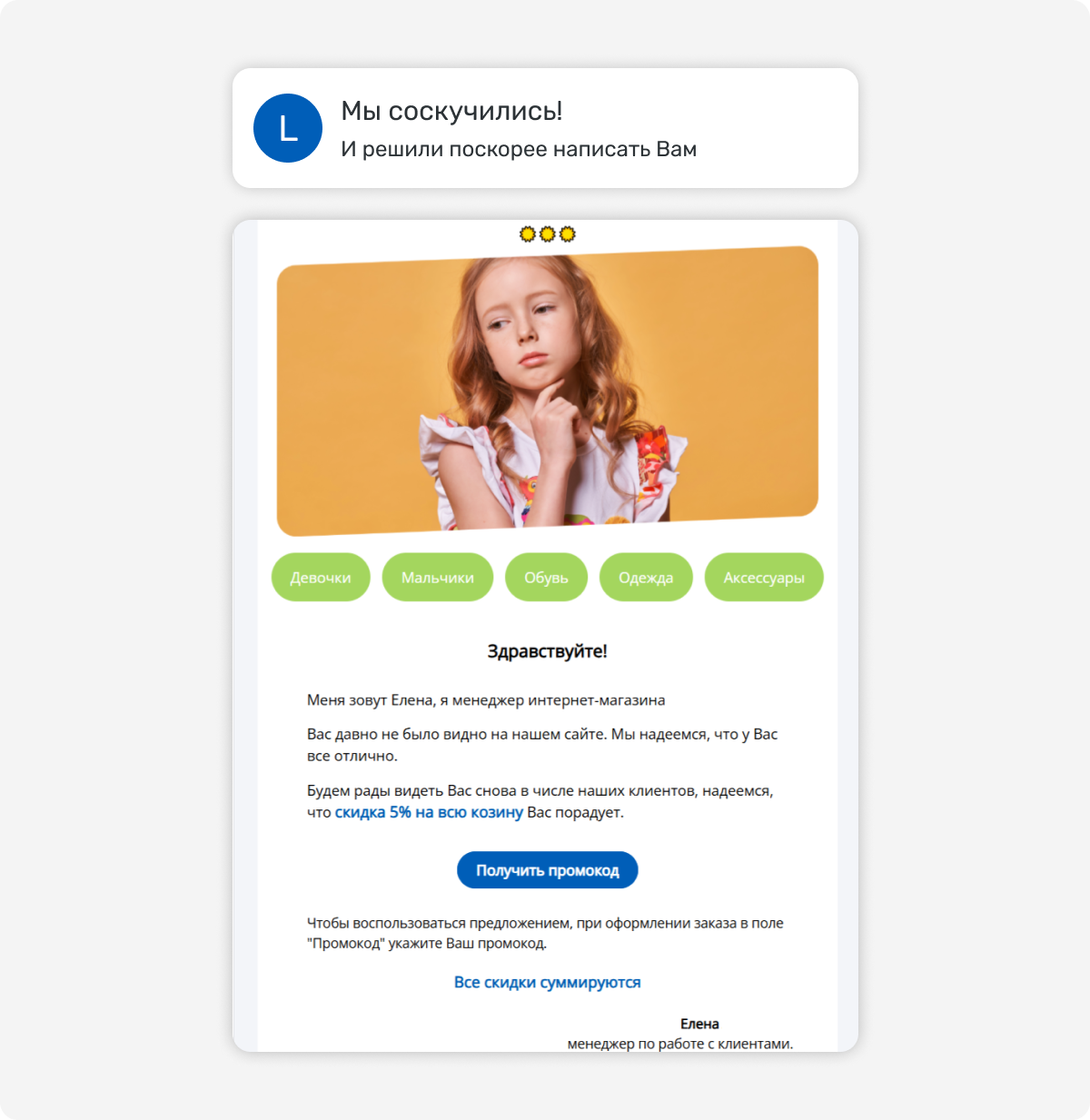 Реактивация запускается по временному триггеру — например, если клиент не совершал покупок и не открывал письма в течение 60, 90 или 180 дней. Структура письма:
